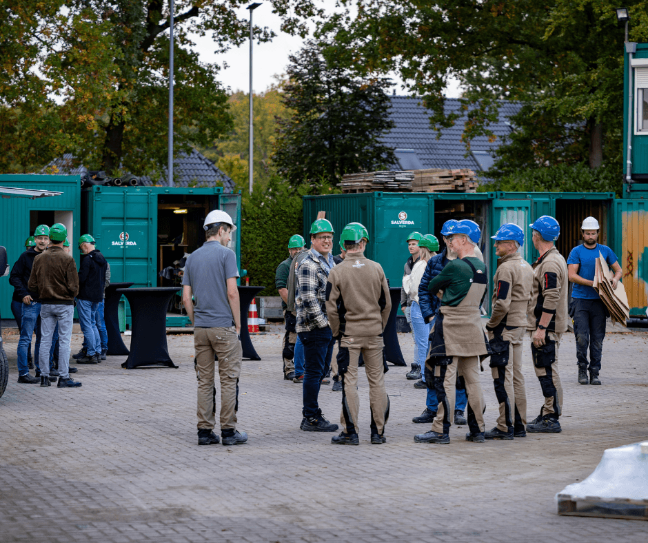 In ’t Harde, op een steenworpafstand van ons kantoorpand, bouwen we aan iets heel bijzonders: onze eigen, gloednieuwe timmerwerkplaats. De plek waar vakmanschap, ambacht en innovatie al sinds 1964 samenkomen, krijgt een upgrade. Want na ruim 60 jaar is het tijd voor een werkplaats die net zo toekomstgericht is als onze projecten. Afgelopen vrijdag hebben we het hoogste punt bereikt. Dat moest natuurlijk gevierd worden. Alle collega's en onderaannemers die aan dit project werken, kwamen samen om even stil te staan bij deze mijlpaal. Nu is pas echt goed te zien hoe groot en indrukwekkend het pand wordt.