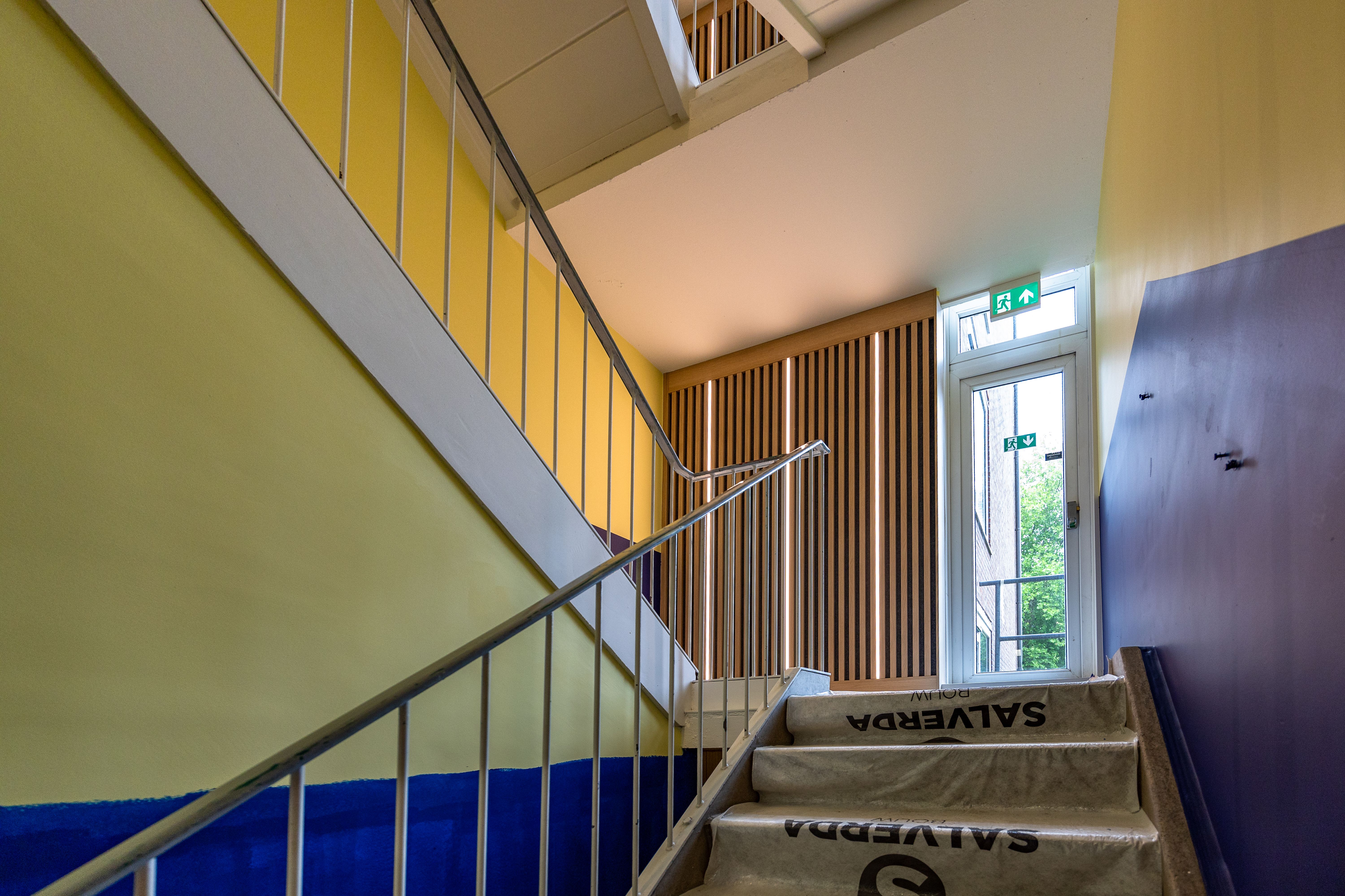 - Het trappenhuis wordt volledig voorzien van een moderne uitstraling met een akoestische lattenwand en wordt volledig brandwerend gemaakt;