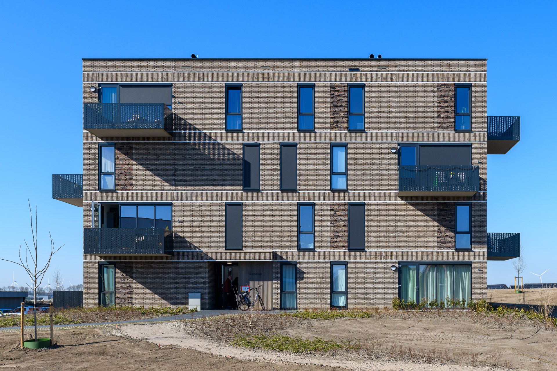 Omdat de appartementen op een zichtlocatie staan, wilde Woonpalet niet de traditionele spijlenhekken op de balkons. De architect (FIER architecten) heeft een speciaal (laser-gesneden) molenmotief verwerkt in de balkonhekken.