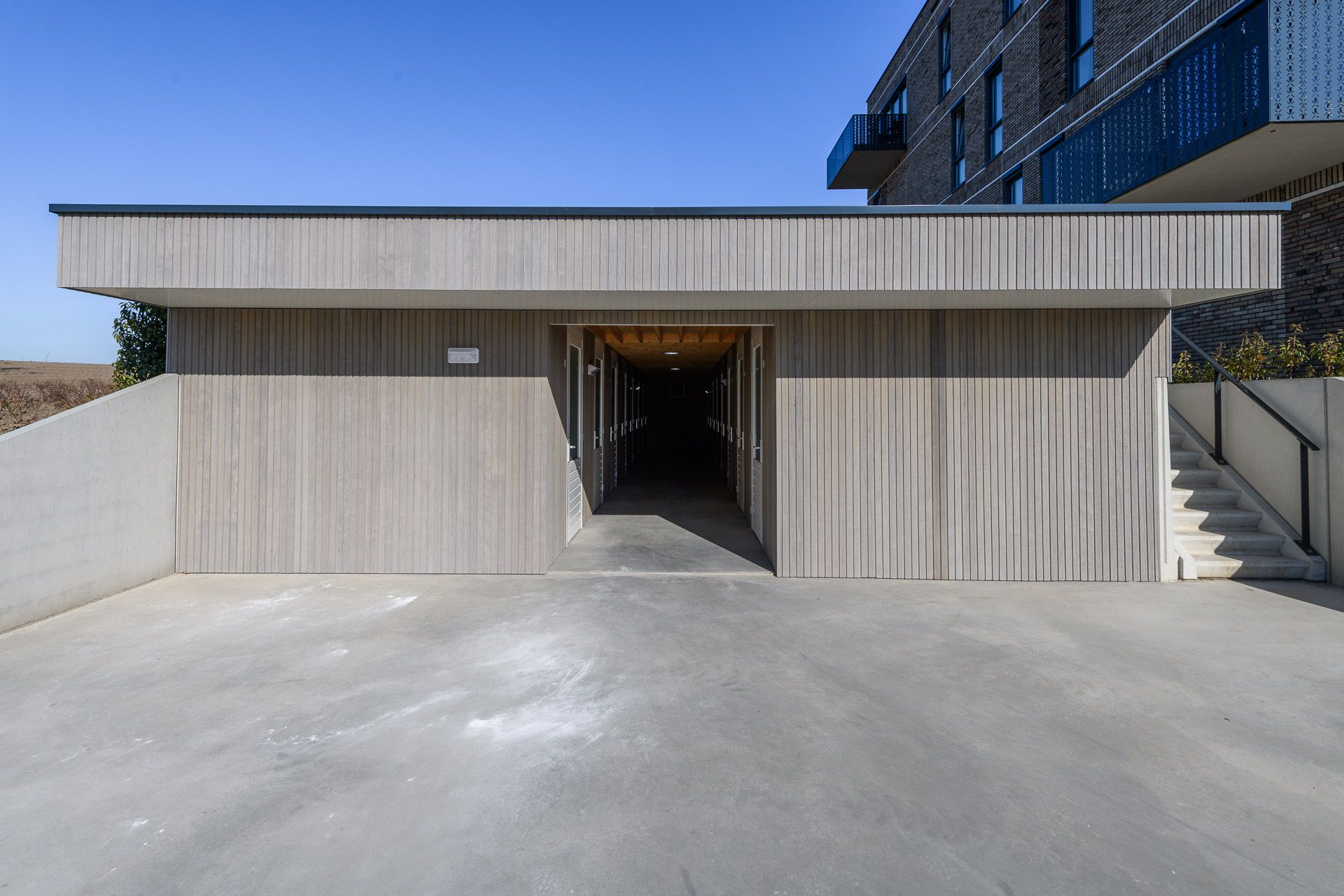 Er is een parkeerhof gerealiseerd tussen de 2 gebouwen in. Deze wordt met veel groen en open straatwerk ingericht, zodat regen goed in de grond kan zakken. De fietsenbergingen zijn glooiend in het landschap verwerkt en krijgen een groen dak.