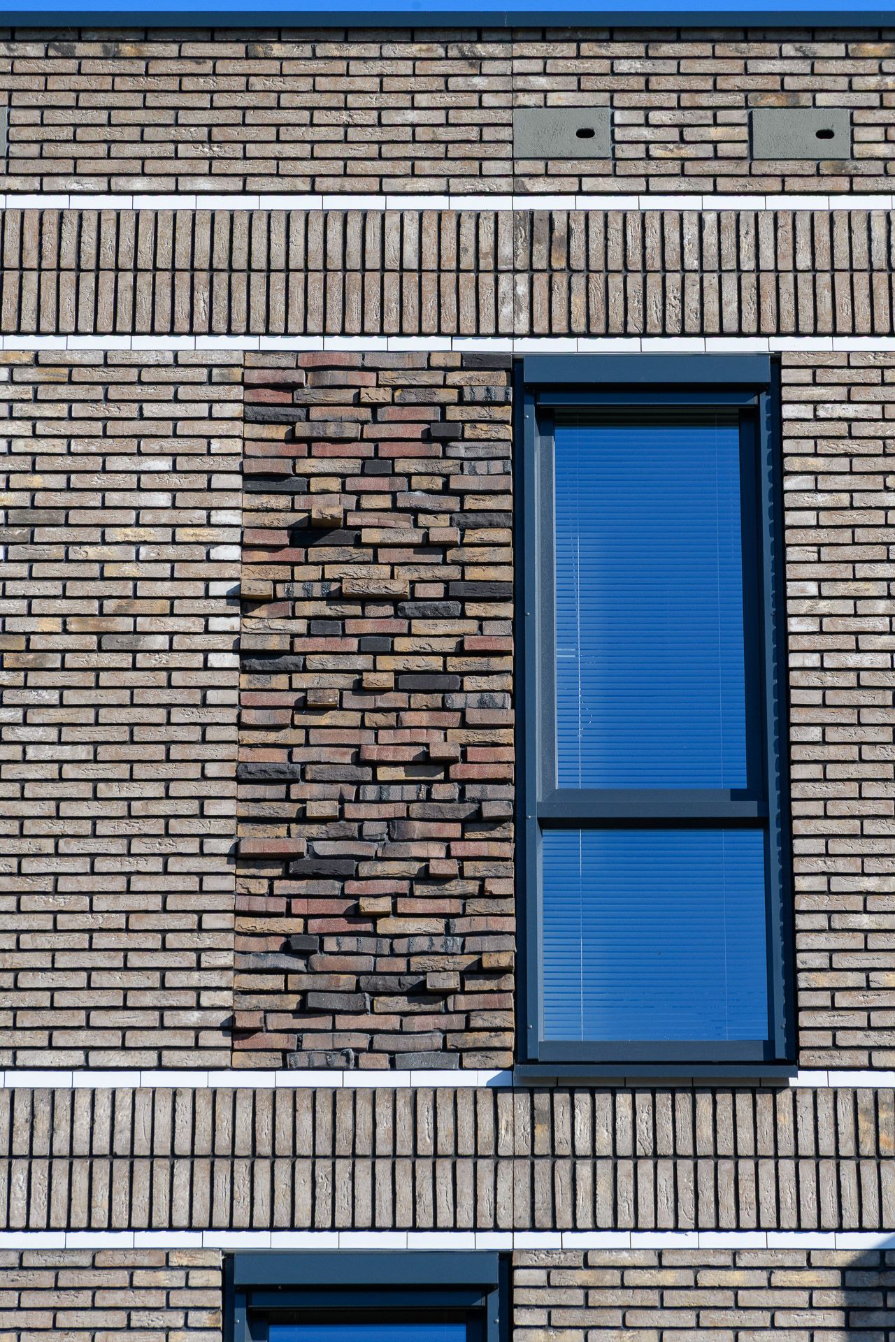 Een mooi voorbeeld van circulariteit is het gebruik van restpartijen en/of afgekeurde bakstenen. Deze bakstenen zijn technisch helemaal in orde, maar ze hebben bijvoorbeeld net niet de goede kleur of ze hebben een net iets te grove structuur. Normaal gesproken worden deze “misbaksels” afgekeurd en niet gebruikt. De kleine hoeveelheden van de restpartijen zouden anders in de container belanden. FIER architecten heeft ervoor gekozen deze stenen wel te gebruiken. Namelijk in de vlakken die naast de ramen komen.
