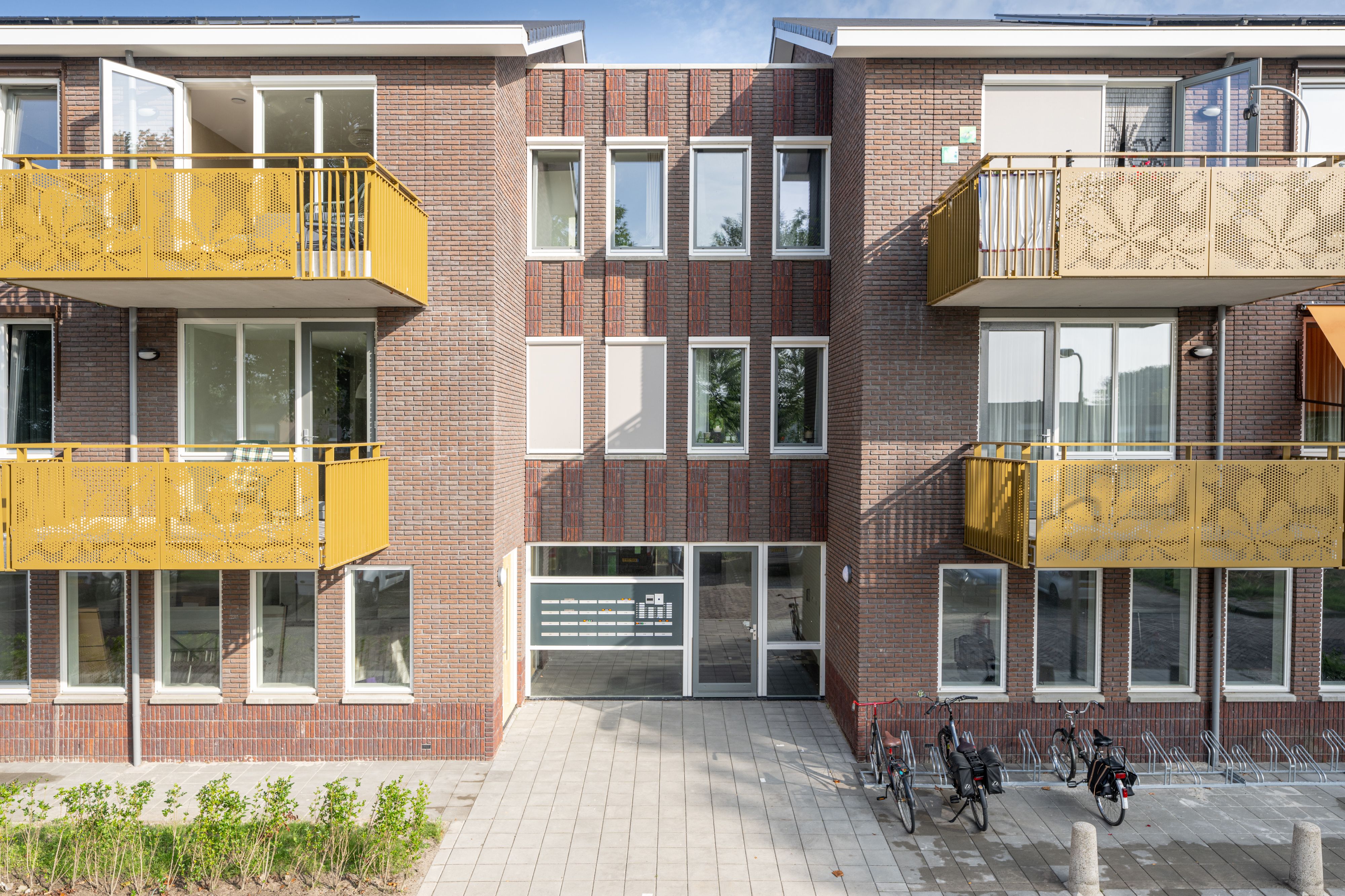 De gevels zijn uitgevoerd met hetzelfde metselwerk als de tegenovergelegen woningen. De entrees zijn geaccentueerd met houten gevelbekleding. Zo is met kleuren en materialen de eenheid met de omgeving benadrukt.