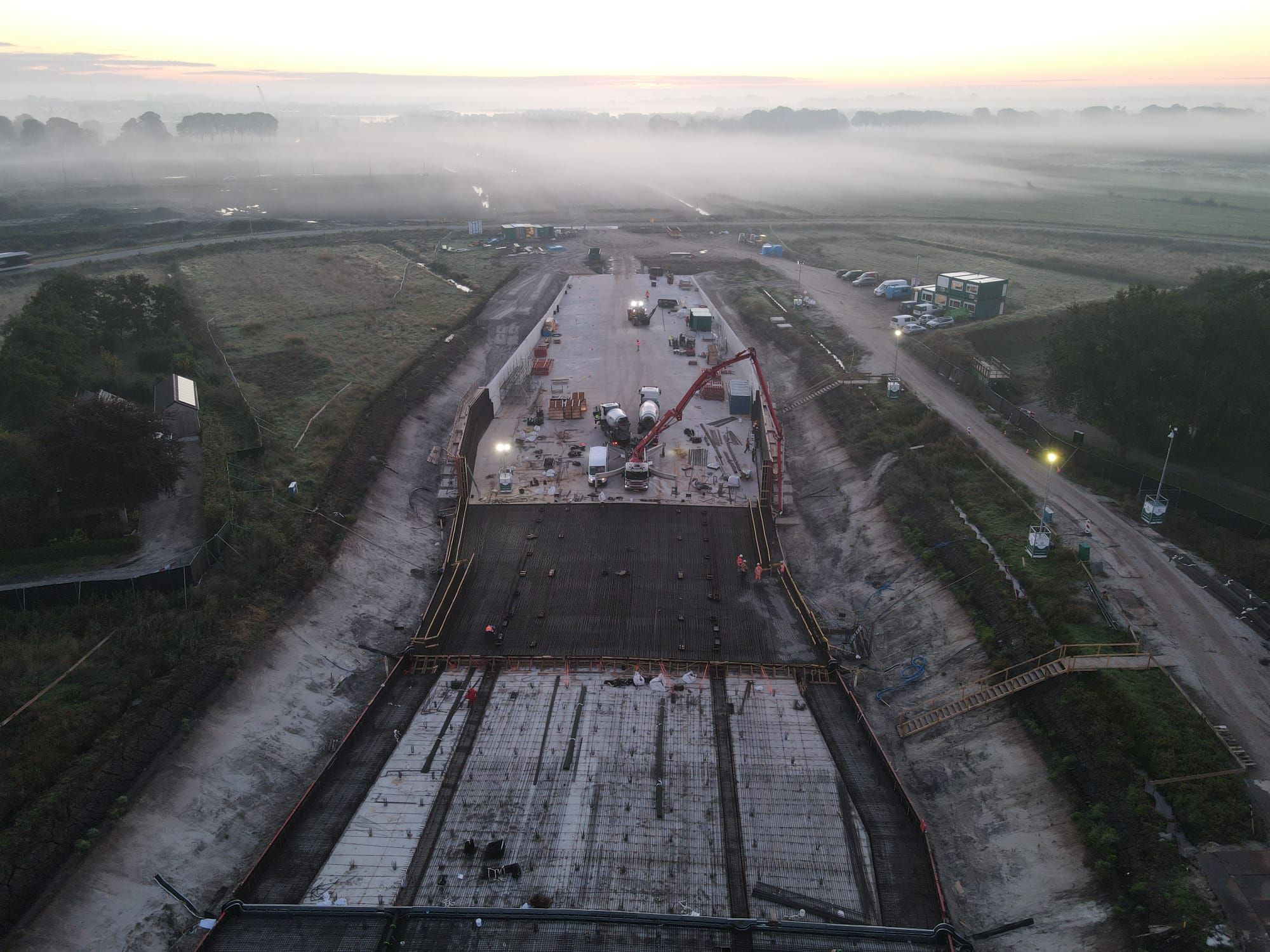 De onderdoorgang is opgedeeld in 9 moten waarover een viaduct gerealiseerd zal worden. Sinds de start in maart 2022 is er al veel werk verzet. Er zijn 17 meter lange tijdelijke damwanden aangebracht tot in een waterdichte kleilaag. Zo creëerden wij een waterdichte kuip die vervolgens door bemaling leeg is gepompt om in het droge te werken. Toen de grondwaterstand binnen de kuip op voldoende diepte was, is de kuip ontgraven en zijn er vervolgens 1.023 stuks betonnen heipalen aangebracht om de volledige constructie te funderen.