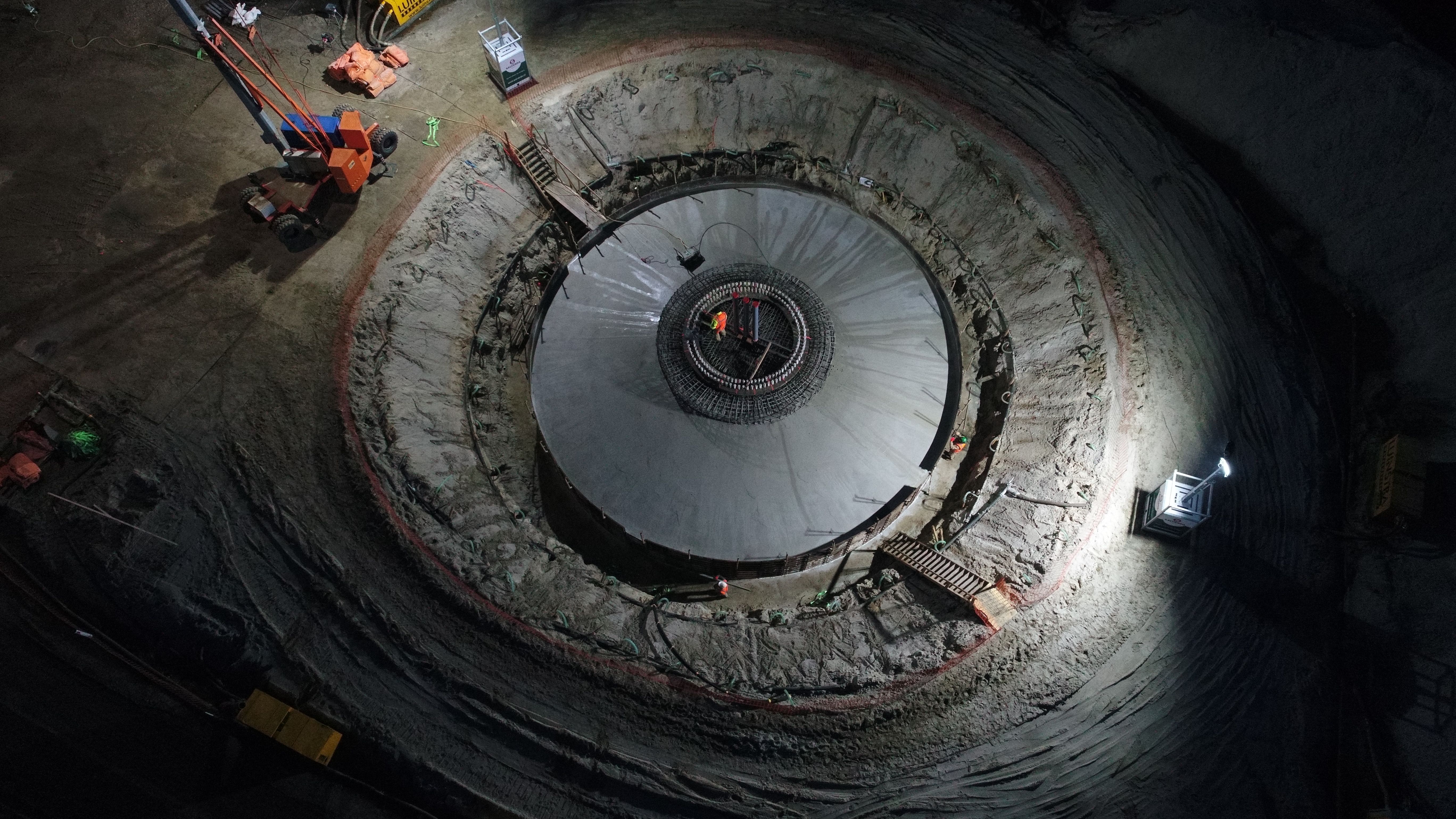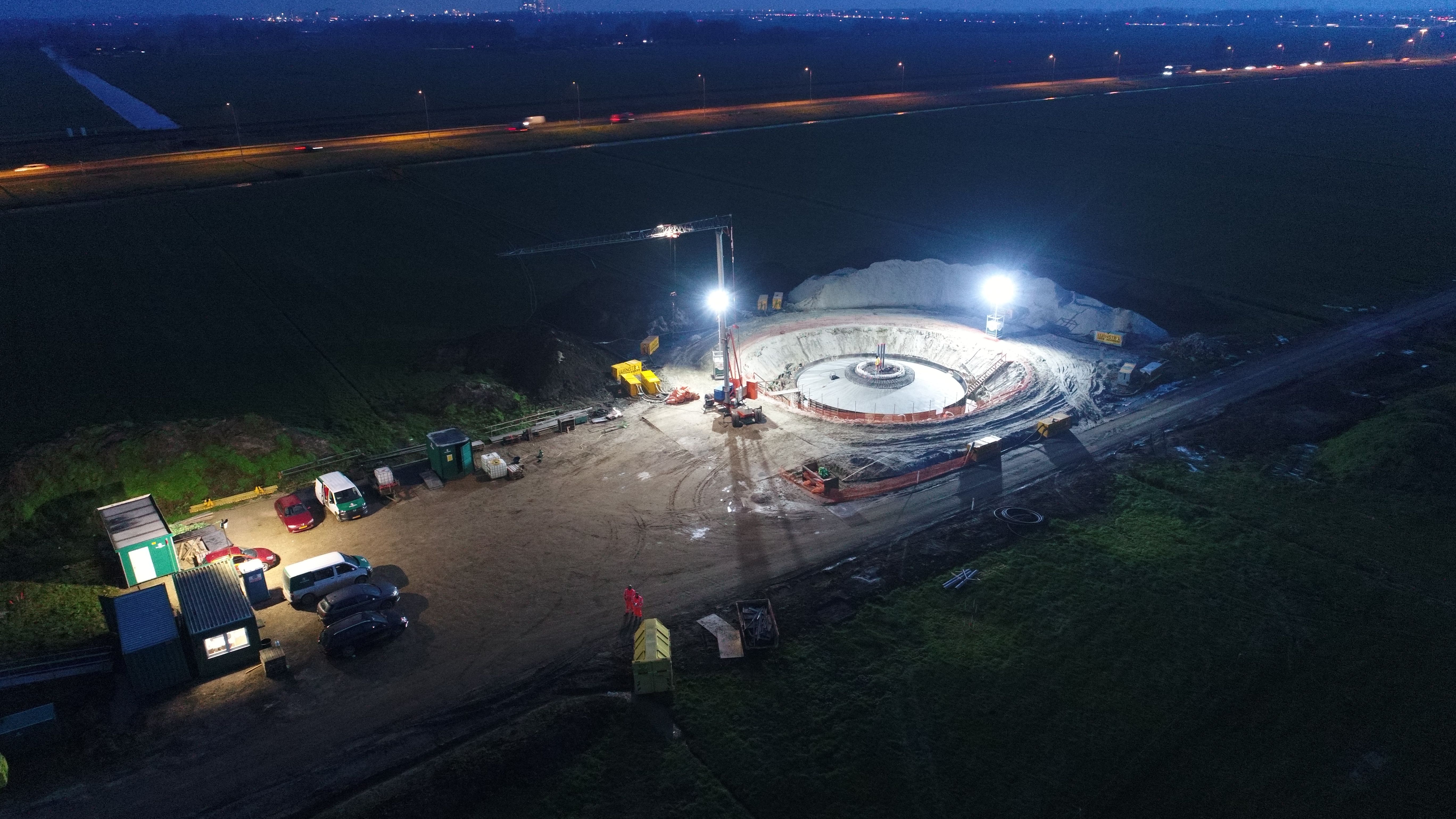 In week 37 van 2020 werd gestart met het installeren van de vibropalen door Gebr. van ’t Hek. Aansluitend zijn tot en met week 52 de fundaties gefaseerd gebouwd. Ten behoeve van een droge bouwput is gebruik gemaakt van open bemaling. Dit is, samen met het grondwerk, het aanbrengen van de mantelbuizen ten behoeve van de kabels en het snellen van de palen, uitgevoerd door Van Werven Infra. Het assembleren en installeren van de ankerkransen is door Salverda Bouw uitgevoerd. De wapening is aangebracht door MVM betonstaal. De beton is geleverd door de Betoncentrale Hasselt.