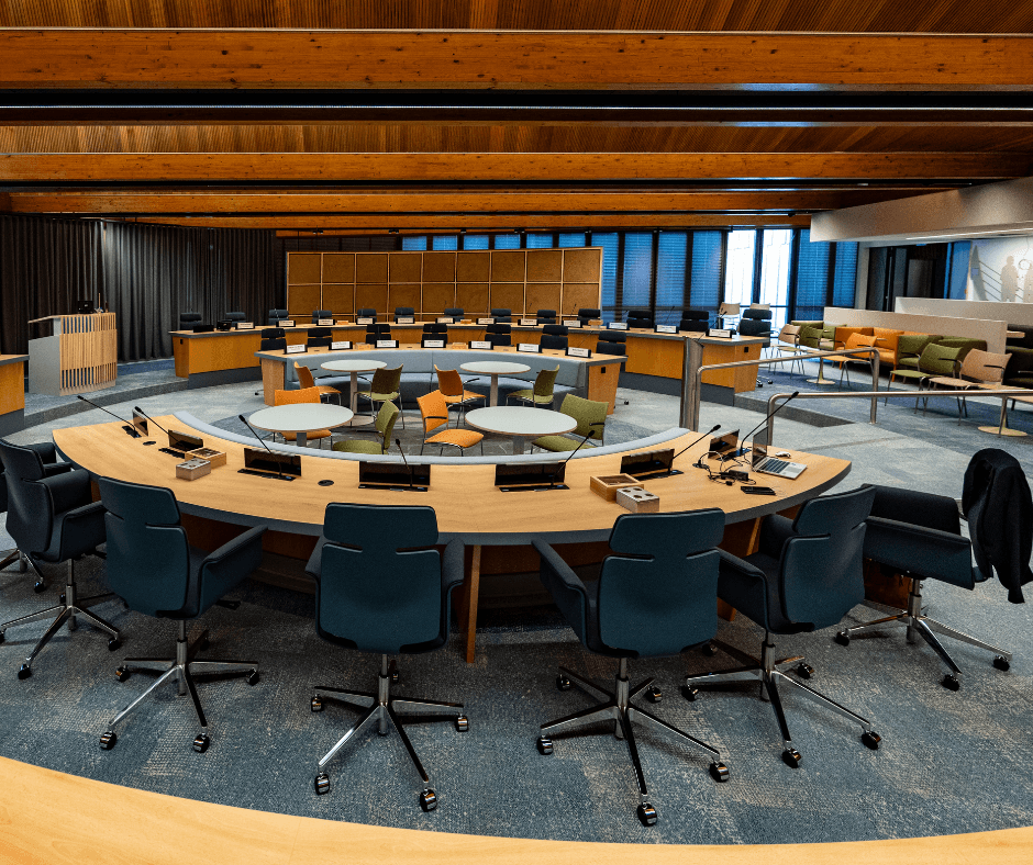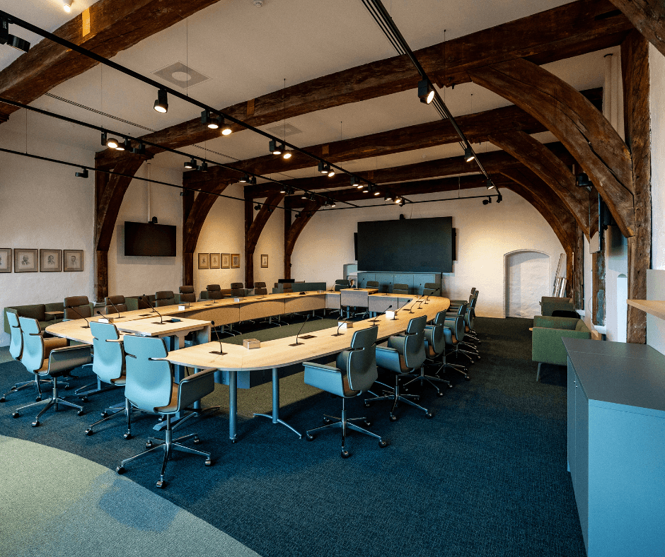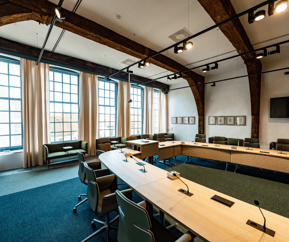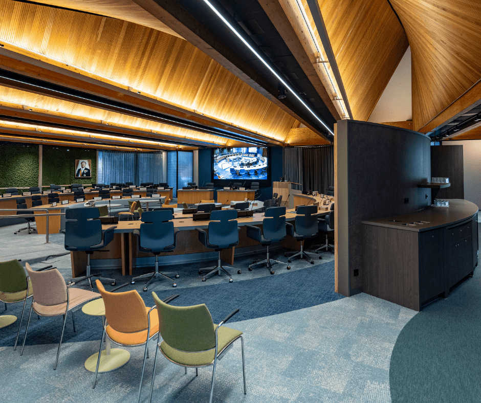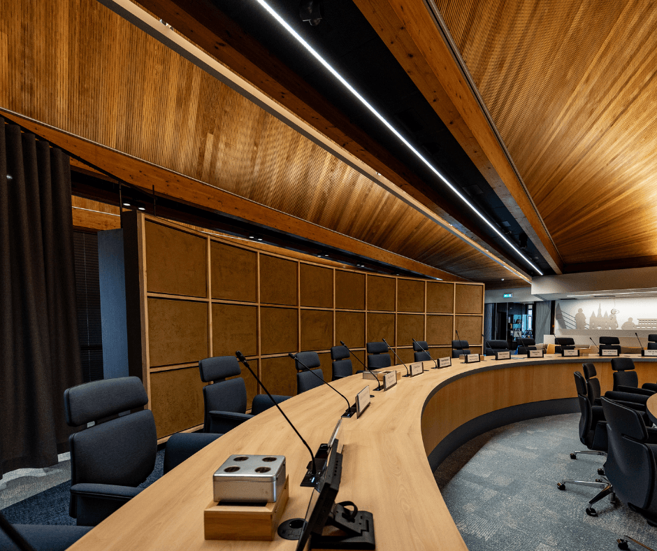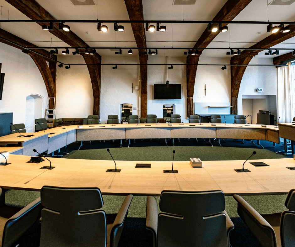 Daarnaast hebben we de raadzaal vergroot door techniek en installaties compacter onder te brengen in een kleinere kast en in het plafond. Hierdoor kwam er meer ruimte vrij voor beweging en gebruik.